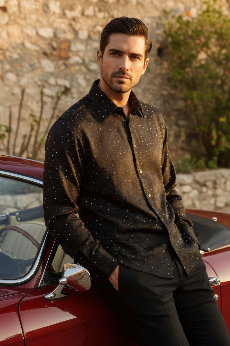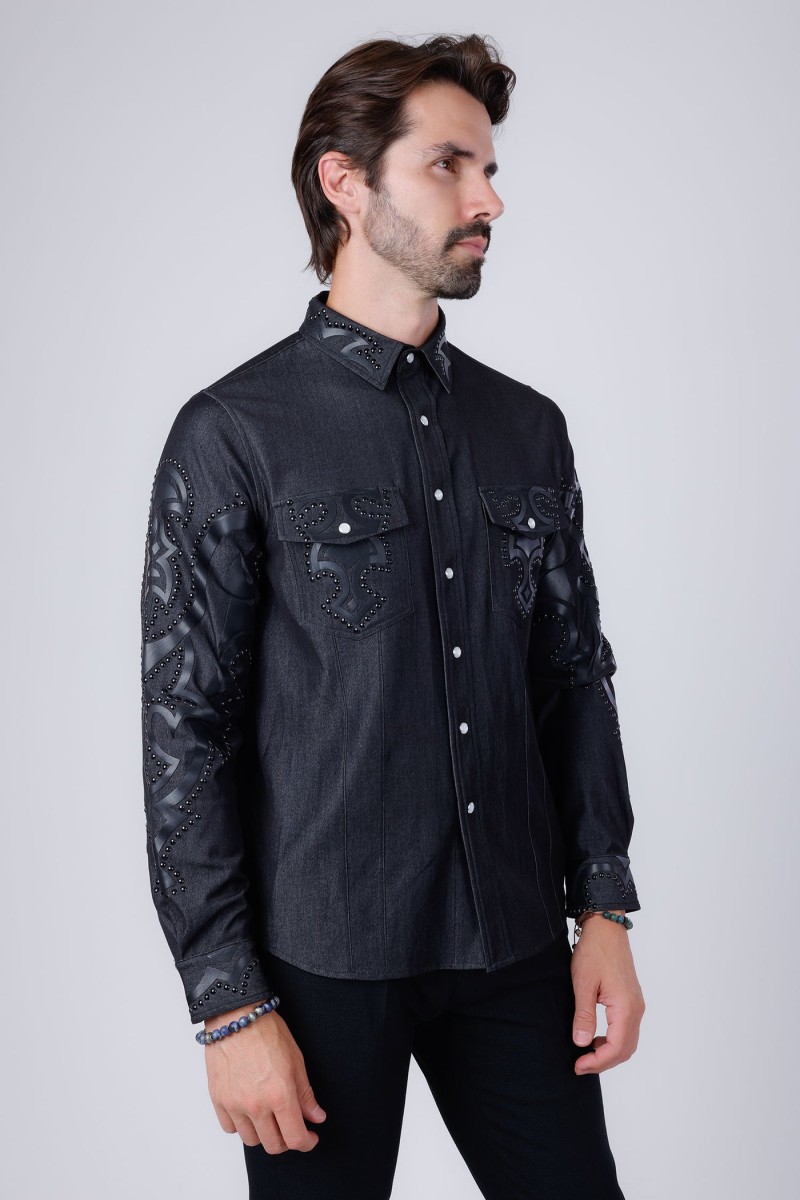 Elevate your wardrobe with the sleek and elegant Barabas long-sleeve men’s slim fit shirt. Featuring a striking studded design and a functional button-up front, this shirt is both stylish and practical. The innovative stretch fabric offers ultimate comfort and flexibility. Make a statement with Riyadh Studded Long Sleeve Shirt.
