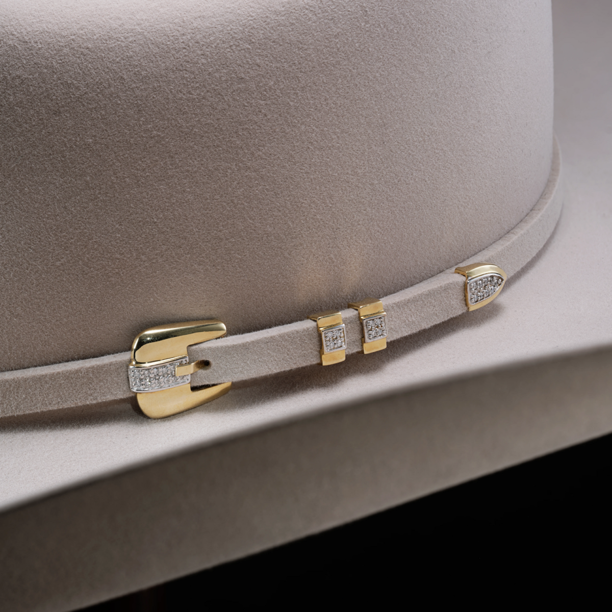 A true Stetson icon, personalized especially for you. The Diamante 1000X is a western hat unlike any other, both a true luxury item and a legacy piece designed to be passed down generations. It takes its name from the 26 genuine diamonds that adorn its 14K gold three-piece buckle set and it stands as a shining example of Stetson’s legendary craftsmanship. It’s handmade in Texas from our proprietary 1000X quality beaver and chinchilla fur felt, which is prized for its unrivaled resilience and soft, elegant, ultrapremium feel.